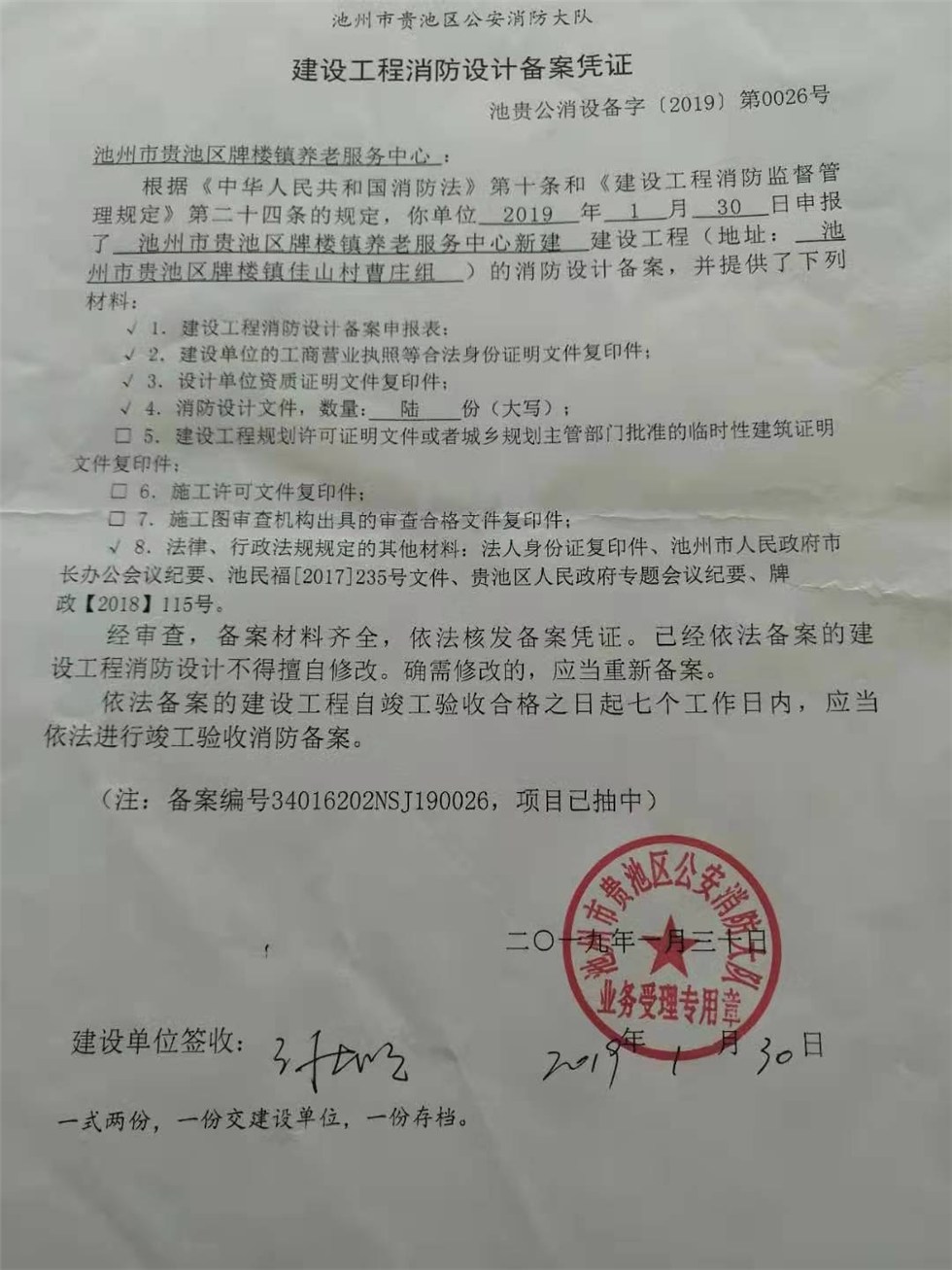 截止2025年10月,牌樓鎮(zhèn)敬老院未進行新的消防改造,無需重新申報,以2019年“建設工程消防設計備案憑證”為準。