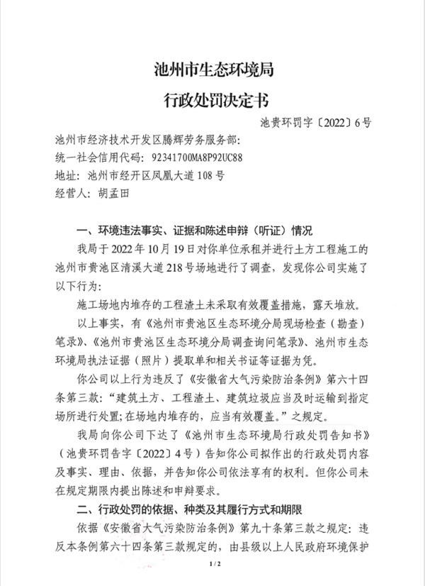 | 名稱: | 池州市生態(tài)環(huán)境局行政處罰決定書(池州市經(jīng)濟技術(shù)開發(fā)區(qū)騰輝勞務(wù)服務(wù)部)(池貴環(huán)罰字〔2022〕6號) | 文號: | 池貴環(huán)罰字〔2022〕6號 |