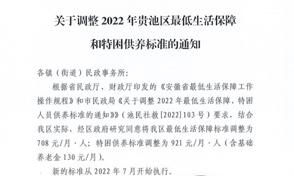 【2023年保障標準】關于調(diào)整2022年貴池區(qū)最低生活保障和特困供養(yǎng)標準的通知