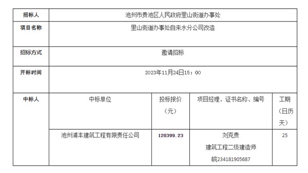 里山街道辦事處自來水分公司改造中標(biāo)結(jié)果公示