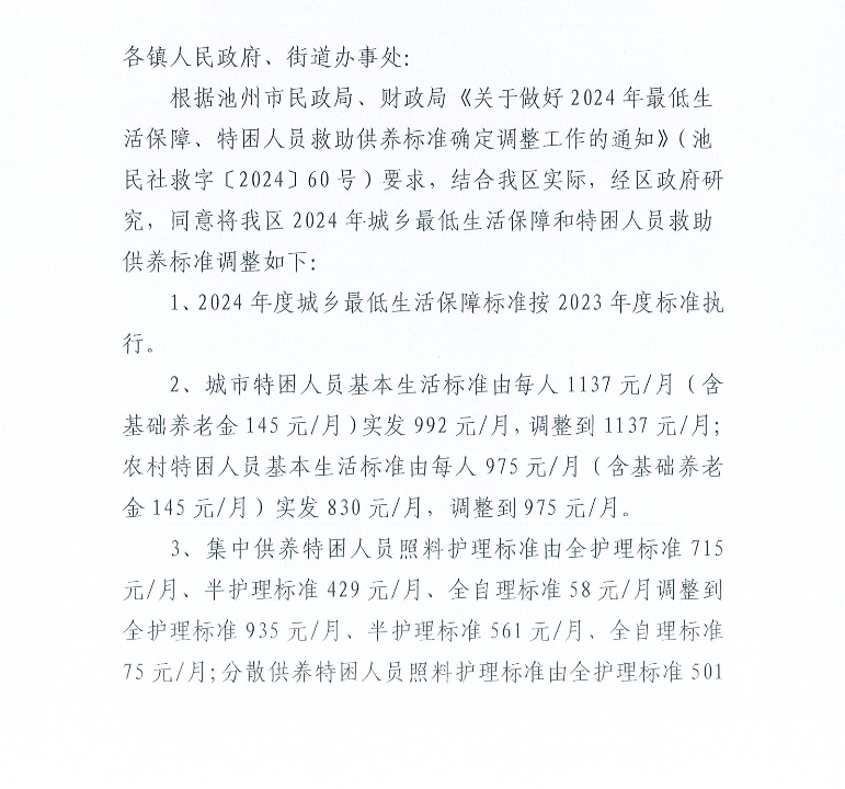 關于調整2024年貴池區(qū)最低生活保障和特困人員救助供養(yǎng)標準的通知