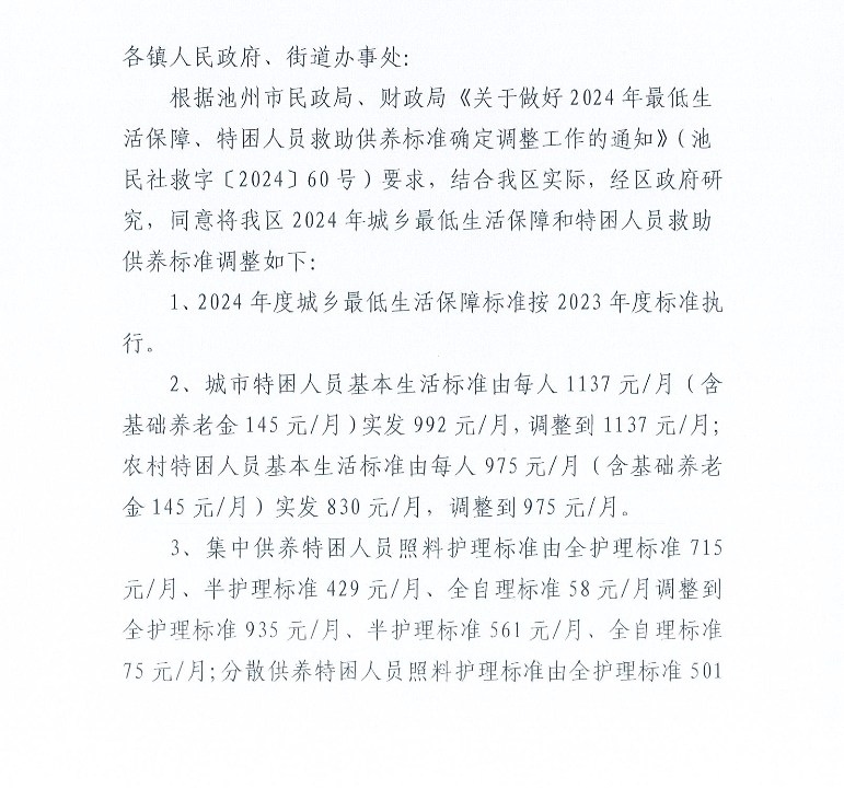 關(guān)于調(diào)整2024年貴池區(qū)最低生活保障和特困人員救助供養(yǎng)標(biāo)準的通知