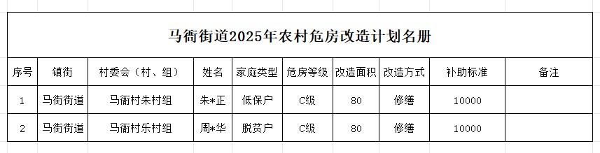 馬衙街道2025年農(nóng)村危房改造計劃名冊