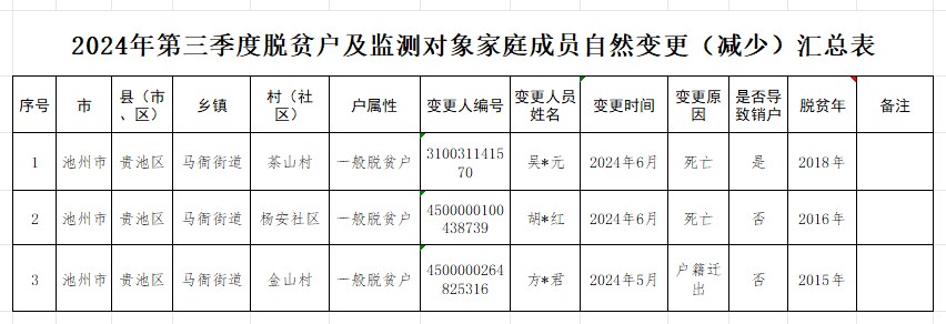 馬衙街道2024年第三季度脫貧戶及監(jiān)測對象家庭成員自然變更(減少)匯總表