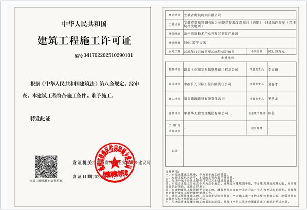 | 名稱: | 安徽省貴航特鋼有限公司燒結(jié)技術(shù)改造項(xiàng)目(四期)-1#燒結(jié)冷卻室(含1#燒冷變電所) 《建筑工程施工許可證》批后公布 | 文號: | 無 |