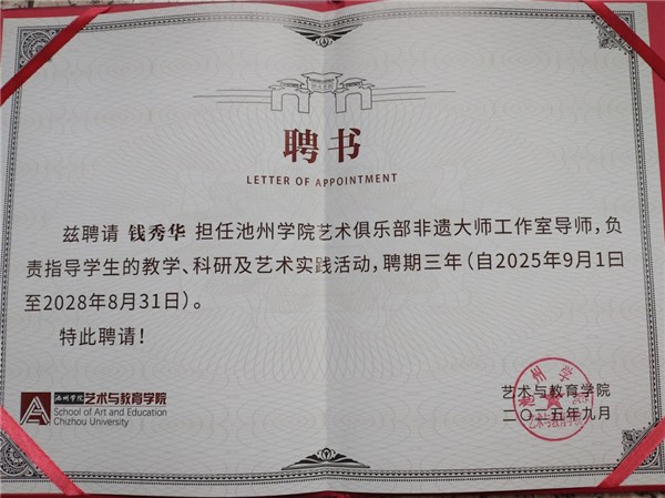 12月4日,貴池民歌省級(jí)代表性傳承人錢(qián)秀華大師工作室揭牌暨受聘儀式在池州學(xué)院藝術(shù)與教育學(xué)院成功舉行。該工作室由貴池區(qū)文旅局與池州學(xué)院藝術(shù)與教育學(xué)院合作共建,旨在推動(dòng)貴池民歌這一非物質(zhì)文化遺產(chǎn)的活態(tài)傳承與當(dāng)代創(chuàng)新。