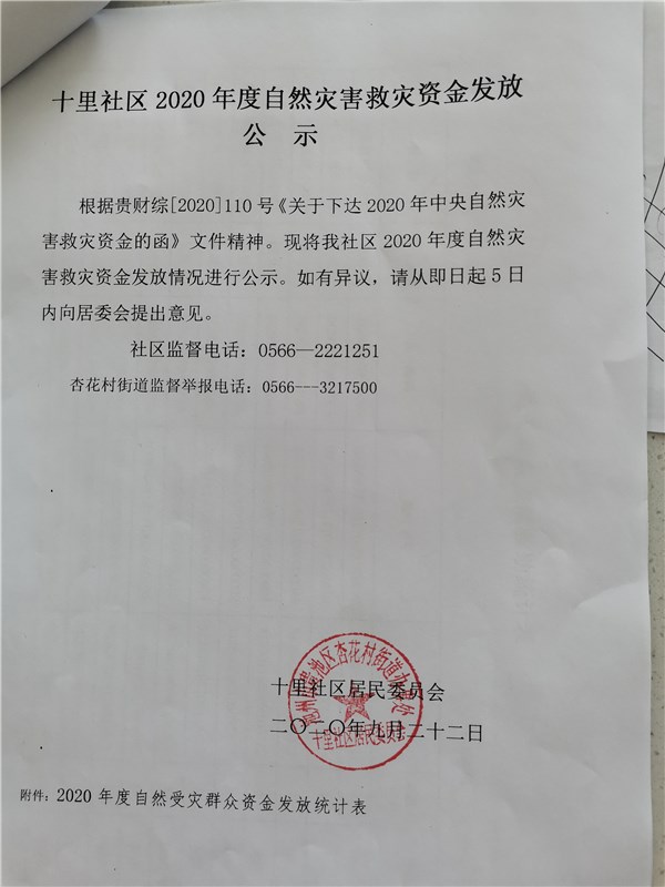 杏花村街道十里社區(qū)2020年度自然災(zāi)害救災(zāi)資金發(fā)放公示(第二批)