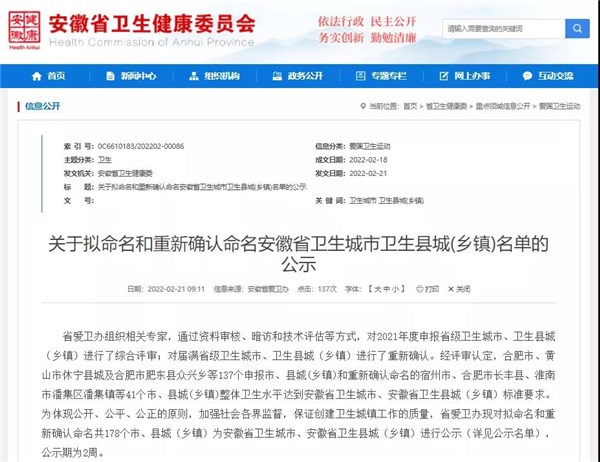 省愛(ài)衛(wèi)辦組織相關(guān)專(zhuān)家,通過(guò)資料審核、暗訪(fǎng)和技術(shù)評(píng)估等方式,對(duì)2021年度申報(bào)省級(jí)衛(wèi)生城市、衛(wèi)生縣城(鄉(xiāng)鎮(zhèn))進(jìn)行了綜合評(píng)審;對(duì)屆滿(mǎn)省級(jí)衛(wèi)生城市、衛(wèi)生縣城(鄉(xiāng)鎮(zhèn))進(jìn)行了重新確認(rèn)。經(jīng)評(píng)審認(rèn)定,合肥市、黃山市休寧縣城及合肥市肥東縣眾興鄉(xiāng)等137個(gè)申報(bào)市、縣城(鄉(xiāng)鎮(zhèn))和重新確認(rèn)命名的宿州市、合肥市長(zhǎng)豐縣、淮南市潘集區(qū)潘集鎮(zhèn)等41個(gè)市、縣城(鄉(xiāng)鎮(zhèn))整體衛(wèi)生水平達(dá)到安徽省衛(wèi)生城市、安徽省衛(wèi)生縣城(鄉(xiāng)鎮(zhèn))標(biāo)準(zhǔn)要求。為體現(xiàn)公開(kāi)、公平、公正的原則,加強(qiáng)社會(huì)各界監(jiān)督,保證創(chuàng)建衛(wèi)生城鎮(zhèn)工作的質(zhì)量,省愛(ài)衛(wèi)辦現(xiàn)對(duì)擬命名和重新確認(rèn)命名共178個(gè)市、縣城(鄉(xiāng)鎮(zhèn))為安徽省衛(wèi)生城市、安徽省衛(wèi)生縣城(鄉(xiāng)鎮(zhèn))進(jìn)行公示(詳見(jiàn)公示名單),公示期為2周。