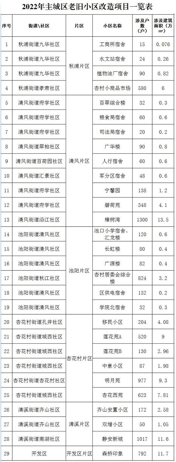 2月21日上午,2022年度主城區(qū)老舊小區(qū)改造工作動(dòng)員部署會(huì)召開。據(jù)了解,2022年主城區(qū)老舊小區(qū)改造申報(bào)計(jì)劃為29個(gè)、改造建筑面積約37.55萬(wàn)平方米,涉及3709戶居民。因池陽(yáng)街道清風(fēng)社區(qū)的鹽業(yè)公司宿舍、軍站宿舍等6個(gè)小區(qū)和秋浦街道的人武部小區(qū)已納入棚戶區(qū)改造規(guī)劃,經(jīng)市政府同意,結(jié)合實(shí)際,已將2022年主城區(qū)改造計(jì)劃進(jìn)行了調(diào)整,調(diào)整后的規(guī)模為: 29個(gè)、建筑面積96.22萬(wàn)平方米,涉及8647戶居民。