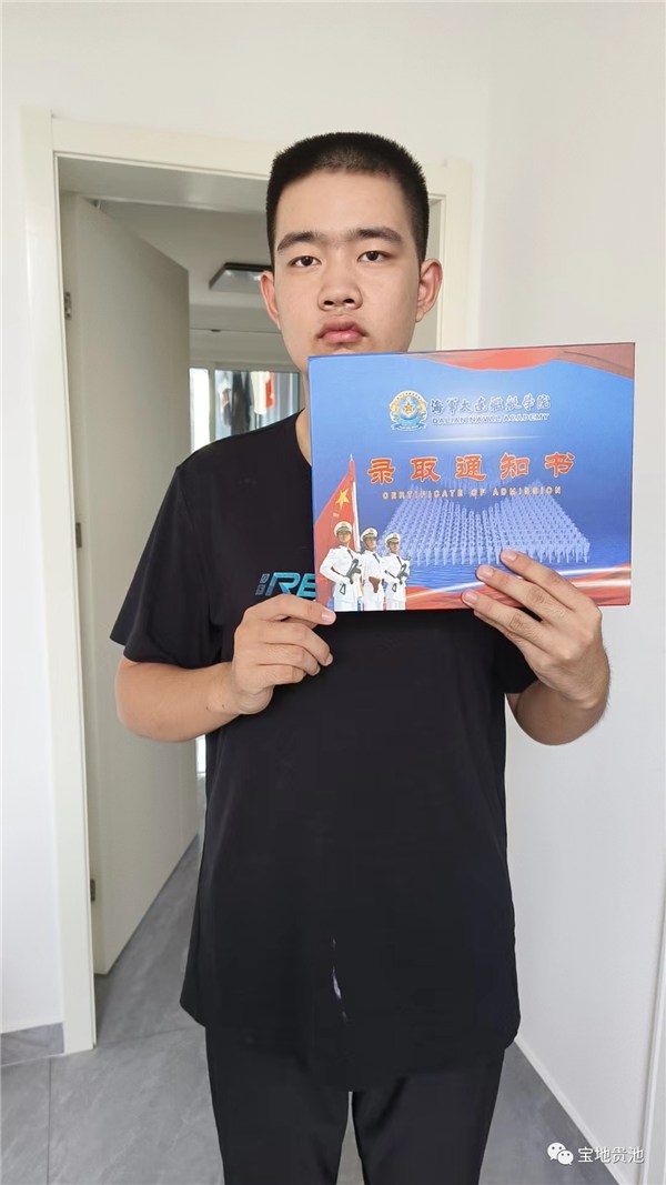 與此同時,池州市第一中學(xué)學(xué)子李圣峰也收到了錄取通知書,他被陸軍勤務(wù)學(xué)院軍事能源工程專業(yè)錄取,即將開啟自己的期待已久的軍校生活。據(jù)李圣峰的母親何智華介紹,早在高一的時候,孩子就曾和自己吐露心聲,想要考軍校、當(dāng)軍人,將來保家衛(wèi)國。“我看著他一步一步地努力邁向自己的目標(biāo),現(xiàn)在終于‘開花結(jié)果’了,我們一家人都特別高興?!焙沃侨A說。李圣峰的父親是一名退役軍人,而他小時候跟著爺爺奶奶在“紅色熱土”棠溪鎮(zhèn)生活,打小就受到了紅色精神的潤育,耳濡目染聽著棠溪革命故事和父親從軍經(jīng)歷長大,“軍校夢”也隨著李圣峰的成長而生根發(fā)芽。在媽媽何智華的眼里,李圣峰是一個特別有主見、有計(jì)劃的孩子,高考一結(jié)束,他便自己規(guī)劃志愿填報(bào),了解軍校報(bào)考條件、流程,為自己“敲”開軍校的大門而努力?!八麖男—?dú)立、堅(jiān)定的性格特別像一個軍人,我相信他將來一定能做一個優(yōu)秀的軍人?!焙沃侨A動情地說道。