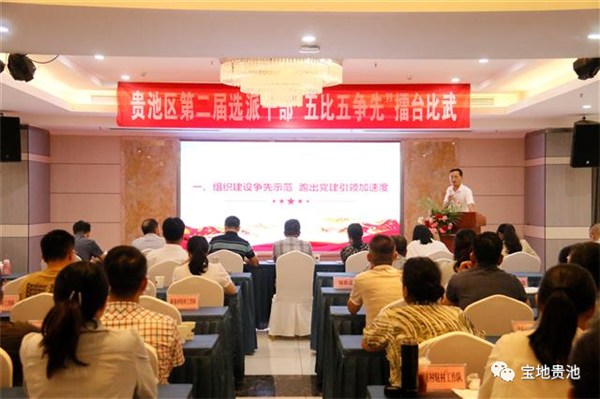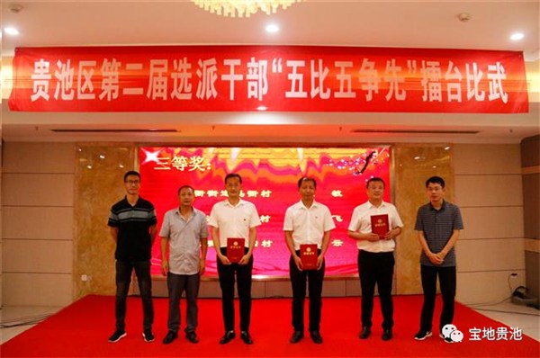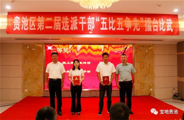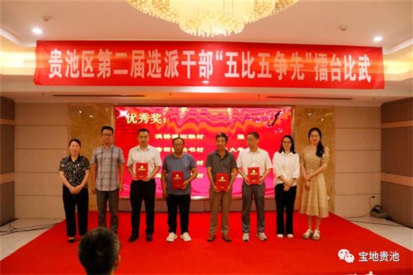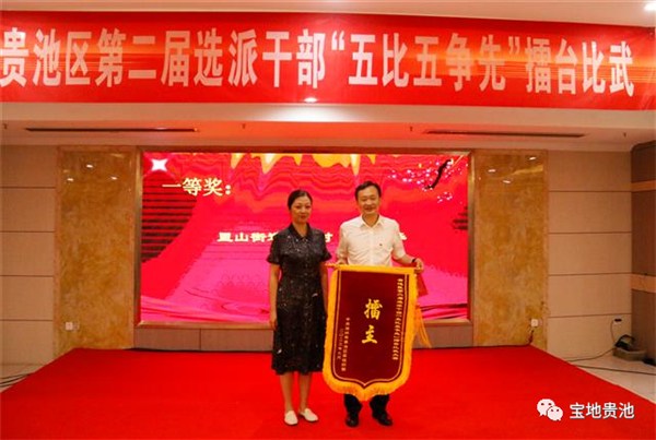 7月31日,貴池區(qū)第二屆選派干部“五比五爭(zhēng)先”擂臺(tái)比武擂鼓開(kāi)賽,19名選派村黨組織書(shū)記輪番上臺(tái)“出招、打擂”,比賽過(guò)程緊張激烈,精彩紛呈。區(qū)委常委、組織部部長(zhǎng)、統(tǒng)戰(zhàn)部部長(zhǎng),區(qū)政協(xié)黨組副書(shū)記,梅龍街道黨工委書(shū)記嚴(yán)貞出席當(dāng)天活動(dòng)并為獲獎(jiǎng)選手頒獎(jiǎng)。