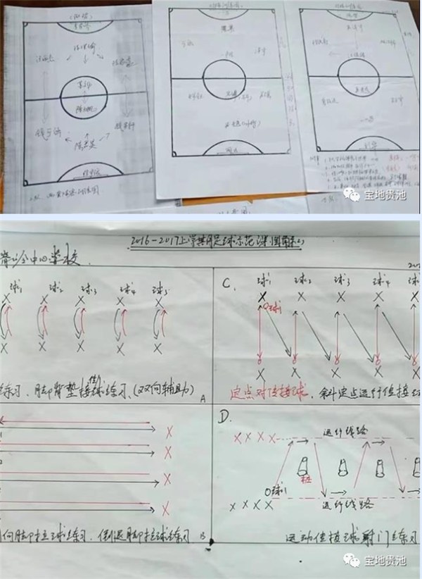 房更生并沒有進行過專業(yè)訓練,但為了教孩子踢球想盡了各種辦法。在他的辦公桌上,兩疊厚厚的手繪版的足球聯(lián)賽賽前戰(zhàn)術(shù)演練圖和手寫版的足球訓練守則是他的教學“法寶”,這是他為孩子們量身定制的訓練計劃?!皩W校沒有專業(yè)的足球老師,我愛好足球,平時我只能看專業(yè)比賽視頻、從網(wǎng)上去學,手機里都是足球視頻:怎么熱身、怎么折返跑,如何根據(jù)他們的身體素質(zhì)進行調(diào)整等等。”就這樣,房更生邊學邊教,邊練邊完善,針對鄉(xiāng)村孩子的特點,摸索出一套行之有效的訓練和比賽方法。
