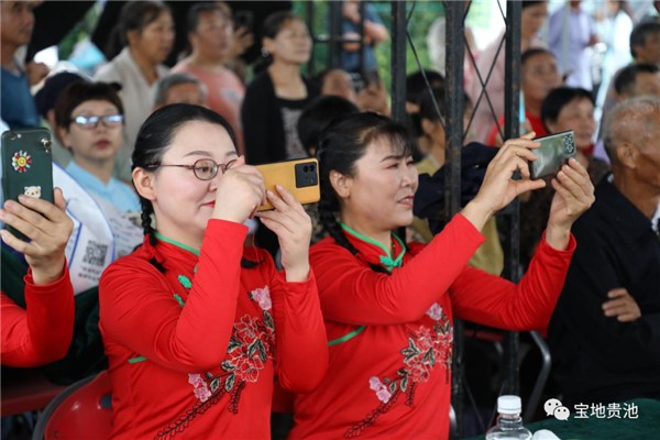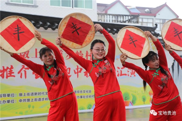 “咚~咚咚、咚~咚咚、呼~哈~……”隨著一陣厚重的擊鼓聲,圍繞在展位前的人群注意力便被轉(zhuǎn)移到了身后的大舞臺(tái)上,原來(lái),當(dāng)天除了農(nóng)產(chǎn)品推介會(huì),該村迎中秋文藝匯演活動(dòng)也在同步開(kāi)展。開(kāi)場(chǎng)鑼鼓《好日子》正式拉開(kāi)了演出的序幕。由領(lǐng)唱錢秀華和墩上街道干部職工為大家?guī)?lái)的羅城民歌《歡迎客人來(lái)墩上》再次點(diǎn)燃現(xiàn)場(chǎng)。隨后,黃梅戲獨(dú)唱《一月思念》》《女駙馬》(選段)、朗誦《春江花月夜》、舞蹈《鄉(xiāng)村振興唱起來(lái)》、儺戲《祝壽》等一批具有當(dāng)?shù)靥厣蚺c中秋佳節(jié)相契合的節(jié)目讓現(xiàn)場(chǎng)觀眾直呼過(guò)癮。