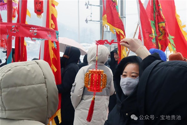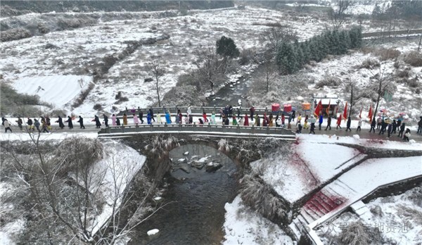 一時(shí),旗傘如林,鑼鼓喧天,浩浩蕩蕩的巡游隊(duì)伍如長(zhǎng)龍般蜿蜒在被潔白外衣覆蓋的山間小道上,神秘而壯觀。