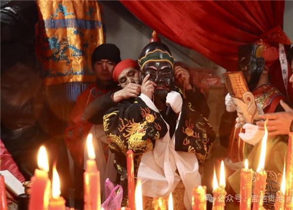 待各執(zhí)事人及參與儺儀表演的人員齊聚祠堂,村中老一輩便會(huì)為今年參演的小輩裝扮。穿戲衣、扎頭巾、向儺神捐拜后再戴上面具……鳴鑼三遍后,整裝待發(fā)的“神隊(duì)”便開始沿著古老的路線“踩村”,村民圍繞在隊(duì)伍兩旁一起哄搶傘上的燈籠,祈盼新年好運(yùn)久久。