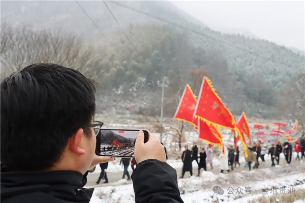 “網(wǎng)友們,今天小胖支書帶大家看看源溪的儺戲!”“社樹”下,去年剛剛開設(shè)了鄉(xiāng)村振興抖音賬號(hào)的源溪村黨支部書記、村委會(huì)主任聶剛舉起手機(jī)開啟了直播,“源溪村的非遺儺文化一直是貴池文旅的一大亮點(diǎn)。特別是這次還下雪了,許多人不能來到現(xiàn)場(chǎng),我可得多多為網(wǎng)友們直播、拍視頻?!彪m然當(dāng)天還需忙著接待各路訪客,但“小胖支書”認(rèn)為這樣難得的宣傳機(jī)會(huì)可一定不能錯(cuò)過。他介紹,去年以來,源溪漫鄉(xiāng)生態(tài)旅游建設(shè)項(xiàng)目在該村落地,許多村民也借此機(jī)會(huì)返鄉(xiāng)創(chuàng)辦農(nóng)家樂,春節(jié)以來,村中的4戶農(nóng)家樂和露營地一直生意火爆,累計(jì)營業(yè)額已超過2萬元,傳統(tǒng)節(jié)日里儺文化與文旅項(xiàng)目結(jié)合迸發(fā)的加速度,令大家更添以文旅產(chǎn)業(yè)助力鄉(xiāng)村振興發(fā)展的信心。