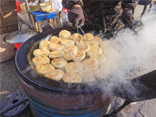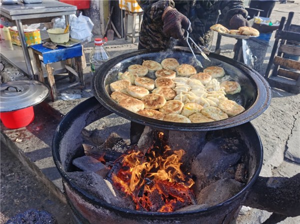 冬日清晨,寒氣朦朧,殷匯街路口小粑攤點(diǎn)周邊已經(jīng)圍滿了食客。木柴火炙烤著平底鍋,熱氣騰騰,煙火氣十足。