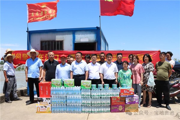 在沿江大堤上,該街道一線防汛人員正在值守查險,江口商會愛心企業(yè)代表一行走上圩埂,十分感謝防汛人員的辛苦付出,將慰問物資送到值守人員手中,叮囑大家在防汛值守時,也要多注意休息和加強自身安全,傳遞出商會和社會各界對防汛工作的高度關(guān)注與大力支持,表達了對值守人員的深切關(guān)懷和感謝。
