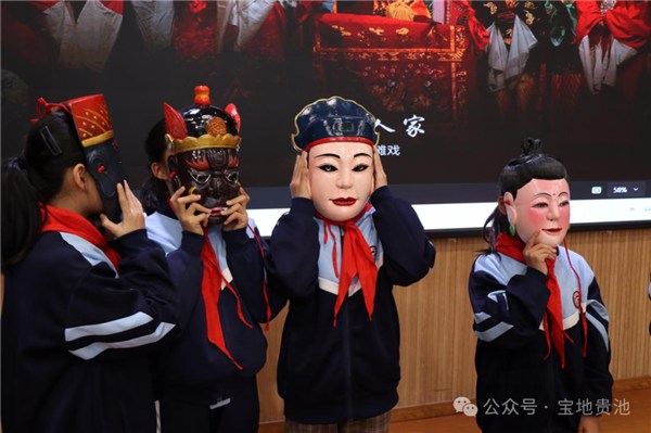 “儺,孕育于新石器時(shí)期,萌生于夏商,形成于周,規(guī)范于‘禮’。池州儺戲被譽(yù)為‘戲曲活化石’,地域特色鮮明,與其他地區(qū)儺文化相比,不僅有完整故事情節(jié),還有儺儀、儺舞等表現(xiàn)形式……”講座上,主講人不僅詳細(xì)講解了儺的由來(lái)、歷史背景、發(fā)展歷程,還分享了池州儺戲中經(jīng)典角色的精彩故事。為了讓同學(xué)們有更直觀的感受,主講人通過(guò)儺面具實(shí)物進(jìn)行介紹,并讓學(xué)生們體驗(yàn)佩戴,使儺戲這一古老藝術(shù)形式更加生動(dòng)地呈現(xiàn)在大家面前。