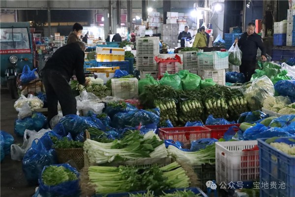 凌晨兩點(diǎn),已是深夜,城市里沒有了白天的喧囂。然而,杏花村農(nóng)產(chǎn)品批發(fā)大市場內(nèi)卻燈火通明、人聲鼎沸。池州市西郊家庭農(nóng)場老板陳小飛的攤位前整齊碼放的菜品吸引了不少批發(fā)商?!拔彝砩鲜c(diǎn)半就從秋江街道過來了,今天運(yùn)了兩千多斤萵筍和花菜,目前的銷售情況還是挺不錯(cuò)的,基本每天都很快銷售一空?!标愋★w介紹道。今年他結(jié)合市場供求情況,種植了花菜、平包菜、小青菜等應(yīng)季蔬菜百余畝,每畝蔬菜產(chǎn)量約三四千斤,現(xiàn)在他每天都能提供三四千斤的蔬菜供應(yīng)。記者在現(xiàn)場看到,除了本地菜農(nóng),批發(fā)市場內(nèi)還有從山東、湖南、湖北等地運(yùn)送來的蔬菜,品種多樣、貨源充足。考慮到氣溫持續(xù)走低,不少供應(yīng)商提前加大了供應(yīng)量,并強(qiáng)化物流保障,確保市場上蔬菜不斷檔。