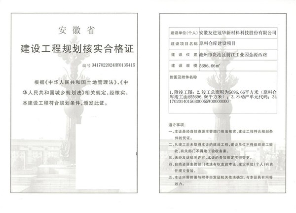 安徽友進(jìn)冠華新材料科技股份有限公司原料倉(cāng)庫(kù)建設(shè)項(xiàng)目建設(shè)工程規(guī)劃核實(shí)合格證公示