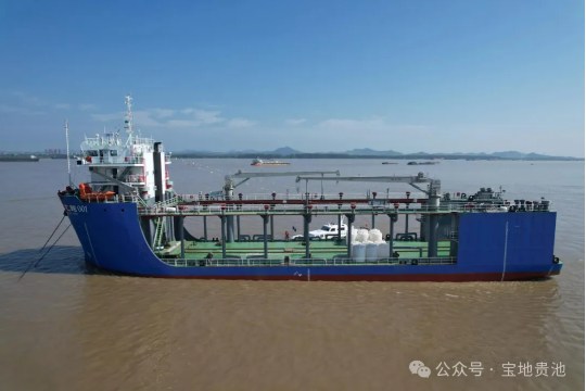 為基地首艘純電推動(dòng)力新能源船舶,由池州鑫飛揚(yáng)船舶修造有限公司建造。該船總長88.9米、型寬13.2米、型深4.6米,載重噸位3000噸。船舶配置2套2042kWh電池組,總電量4084kWh,可滿足船舶單次往返約140公里的航行需求。