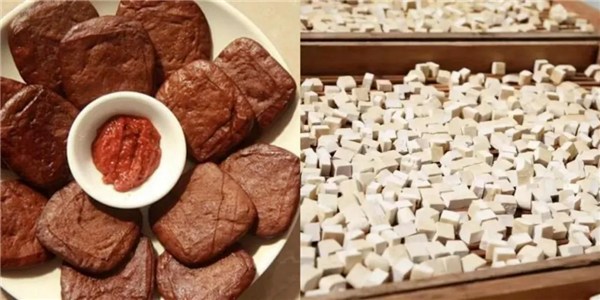 梅村豆腐干(乳)保持石膏點(diǎn)鹵的傳統(tǒng)加工方法,歷經(jīng)黃豆浸泡、磨碎、蒸煮、過(guò)濾、點(diǎn)漿、凝聚、澆制、壓榨、劃坯等工序,坯曬干成型后,再經(jīng)長(zhǎng)時(shí)間文火鹵煮,讓秘制的鹵汁滲透其中,成為香氣撲鼻的梅村豆腐干(乳)。經(jīng)過(guò)發(fā)酵后的梅村豆腐乳,蛋白質(zhì)分解為各種氨基酸,外觀顏色醬紅,內(nèi)質(zhì)玉白細(xì)嫩,韌而不硬、松而不散,吃起來(lái)酥軟鮮香、口感淳樸。