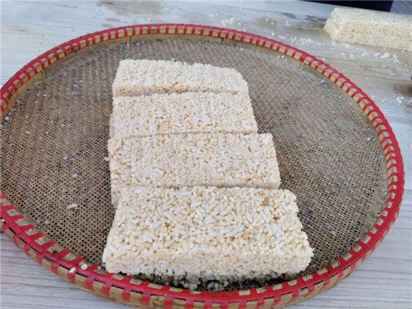 里山街道元四村米糖主要特征為甜、鮮、白。經(jīng)過(guò)備麥芽、下濁(發(fā)酵)、榨汁、熬、拔(拉)等工藝制成糖粑,再把糖粑放入鍋里加熱至糊狀,搬入炒好的芝麻,做成大餅,先切成條狀,再切成片。當(dāng)?shù)貍鹘y(tǒng)是熬糖當(dāng)日不做糖,等臨近過(guò)年時(shí)再做。本地還有用山芋、臭玉米熬糖的歷史,制作過(guò)程與熬米糖大同小異,更有鮮為人知的用金櫻子熬過(guò)糖。
