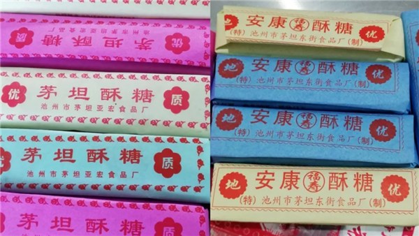 茅坦酥糖制作技藝是70年代成立供銷(xiāo)合作社時(shí),經(jīng)一位姓王的師傅傳授的。茅坦酥糖至今仍采用傳統(tǒng)的手工制作,其用料講究,不加任何防腐劑。在制作過(guò)程中,選用上等芝麻,待磨出油時(shí)才使用,酥糖中加入天然桂花,不用香精。茅坦酥糖的大小薄厚整齊劃一,色澤黑白相間,成螺旋狀,由內(nèi)而外共7層,層次分明。用一張小彩紙包成長(zhǎng)方形,其味香甜、質(zhì)感松軟。抓起成塊,提起成帶,進(jìn)嘴甜酥,口舌生香。茅坦酥糖制作技藝2008年入選貴池區(qū)第一批非物質(zhì)文化遺產(chǎn)代表性項(xiàng)目名錄。