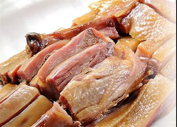阮橋板鴨采用當(dāng)?shù)仄贩N鴨即“齊毛鴨”為原料。每年開(kāi)春育苗飼養(yǎng),立冬時(shí)宰殺,經(jīng)過(guò)祖?zhèn)鞴に囯缰埔粋€(gè)月以上,再自然風(fēng)干。歷經(jīng)20余道工序的阮橋板鴨具有“干、板、酥、香”的特點(diǎn),外觀飽滿,體肥皮白,肉質(zhì)細(xì)嫩緊密。食用時(shí)蒸、煮、煲皆可,口感勁道,肥而不膩,松嫩可口,咸淡適中,味道鮮醇,回味無(wú)窮。當(dāng)?shù)氐娜顦虬屮啛趵宵S豆是一道經(jīng)典的傳統(tǒng)菜肴。