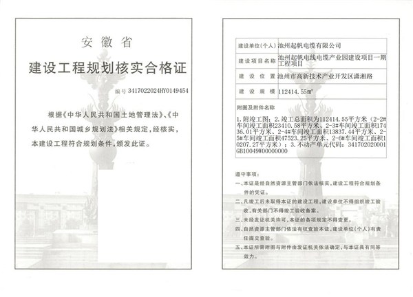 池州起帆電纜有限公司池州起帆電線電纜產(chǎn)業(yè)園建設(shè)項(xiàng)目一期建設(shè)項(xiàng)目2-2#、2-3#、2-4#、2-5#、2-6#車間建設(shè)工程規(guī)劃核實(shí)合格證公示
