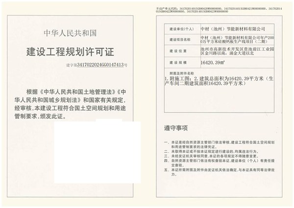 中材(池州)節(jié)能新材料有限公司年產(chǎn)2000萬平方米硅酸鈣板生產(chǎn)線項(xiàng)目(二期)建設(shè)工程規(guī)劃許可證公示