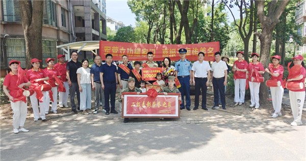 當(dāng)天上午11時許,小區(qū)門前“軍營立功耀家門,喜報千里傳美名”的橫幅格外醒目,喜慶的鑼鼓點燃了現(xiàn)場氣氛,鄰里街坊聞訊而至,簇?fù)碓诘缆穬膳?。在眾人見證下,軍地領(lǐng)導(dǎo)為家屬披上“一人立功,全家光榮”的鮮紅綬帶,并將熠熠生輝的“二級表彰榮譽之家”牌匾送入家中,紅綢映照著家人的喜悅,尊崇之情溫暖流淌。