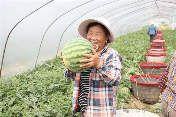 采訪當(dāng)天,多名瓜農(nóng)正在大棚內(nèi)彎腰輕拍西瓜,通過聲響判斷成熟度,隨后麻利地采摘、裝筐、搬運(yùn)裝車。正在忙碌的新義村村民陳潤(rùn)紅笑著說:“從3月西瓜授粉開始,老板便經(jīng)常請(qǐng)我們過來做工,每天工錢80多元,既不耽誤自家農(nóng)活,還能多份收入!”像她這樣實(shí)現(xiàn)家門口就業(yè)的周邊村民,基地已吸納60余人,人均年增收近2萬元。