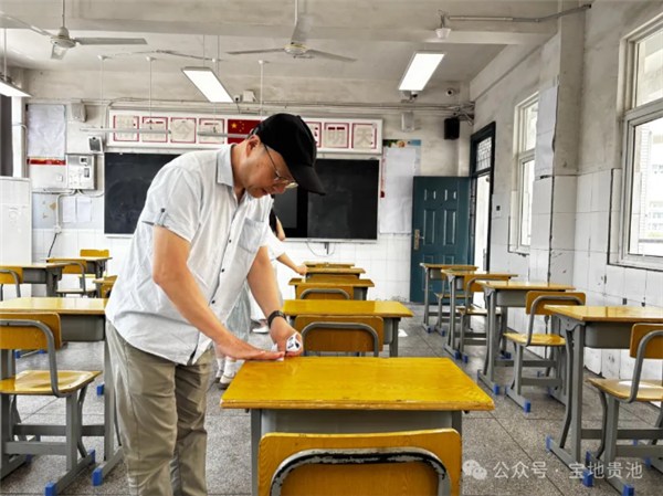 “請(qǐng)各考場(chǎng)核準(zhǔn)時(shí)間,現(xiàn)在是北京時(shí)間上午11時(shí)整……”池州市第三中學(xué)考點(diǎn)監(jiān)考老師曹貴鐘正注視著考場(chǎng)內(nèi)的掛鐘,反復(fù)確認(rèn)時(shí)間準(zhǔn)確無(wú)誤。從早上8點(diǎn)半學(xué)校組織所有監(jiān)考和考務(wù)人員進(jìn)行考前培訓(xùn)到現(xiàn)在,他忙得甚至連喝一口水的時(shí)間都沒(méi)有,排列考桌、貼上門(mén)貼及桌簽、核準(zhǔn)考場(chǎng)時(shí)間、檢查聽(tīng)力設(shè)備……“任何一個(gè)環(huán)節(jié)都不能出任何差錯(cuò)。”曹貴鐘介紹,待細(xì)致核對(duì)考場(chǎng)布置情況無(wú)任何紕漏后,將對(duì)考點(diǎn)教室貼上密封條,等待著考生來(lái)此迎接人生的重要挑戰(zhàn)。