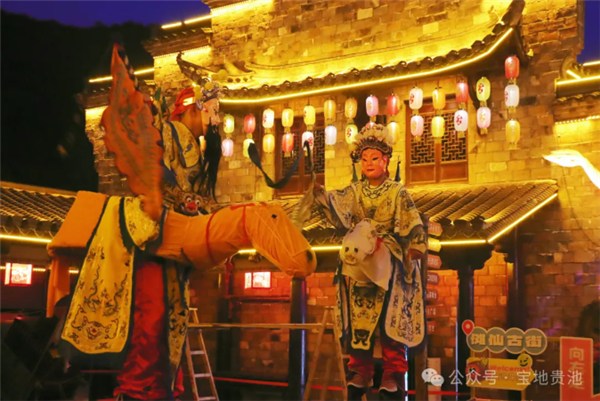 作為活動(dòng)主會(huì)場(chǎng),儺仙鎮(zhèn)景區(qū)以儺文化為主題,為游客奉上了一場(chǎng)視聽盛宴。隨著活動(dòng)點(diǎn)燈儀式啟動(dòng),儺仙鎮(zhèn)景區(qū)燈光全線點(diǎn)亮,點(diǎn)點(diǎn)星河照亮整個(gè)古鎮(zhèn),將這場(chǎng)沉浸式夜游推向高潮。游客從主舞臺(tái)移步,順著儺仙鎮(zhèn)原有的古鎮(zhèn)結(jié)構(gòu)定制的游覽動(dòng)線,品古街?jǐn)偽坏南隹泳G茶、貴池小粑,賞儺面具現(xiàn)場(chǎng)雕刻,伴古老神秘的非遺高蹺馬共同穿行在石板街巷,隨儺仙橋上的村歌表演穿越至霄坑村的綠色秘境,又在溪畔Live悠揚(yáng)的民謠聲中回歸現(xiàn)代文藝的咖啡館……一個(gè)個(gè)輕量型路演舞臺(tái)、美食互動(dòng)品嘗點(diǎn)打造出的夜游動(dòng)態(tài)舞臺(tái)集逛展、互動(dòng)、觀演為一體,“沒(méi)想到這個(gè)白天山清水秀、古色古香的小鎮(zhèn)到了夜晚如此夢(mèng)幻!儺舞的儀式感和古鎮(zhèn)夜色完美融合真是令我們大開眼界!” 來(lái)自杭州的游客陶先生贊嘆不已。夜游設(shè)計(jì)深度整合貴池儺文化資源與儺仙鎮(zhèn)空間載體,為全區(qū)乃至全市“非遺+夜經(jīng)濟(jì)”提供了鮮活樣板。