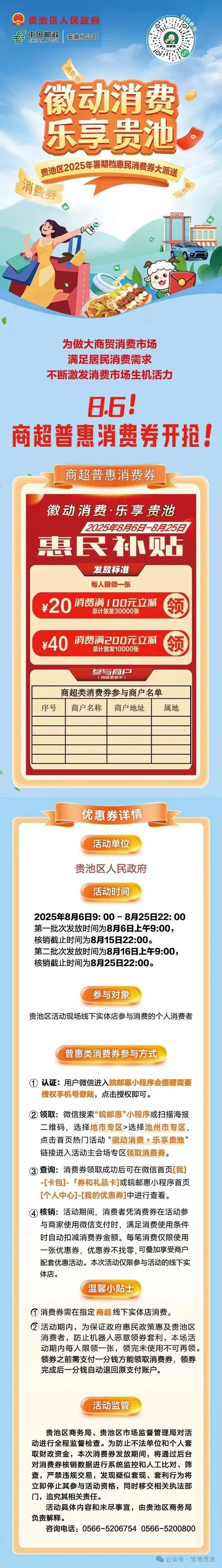 8月6日9:00第一批次投放各面值60%的消費(fèi)券(其中,20元券18000張,40元券6000張),核銷截止時(shí)間為2025年8月15日22:00。