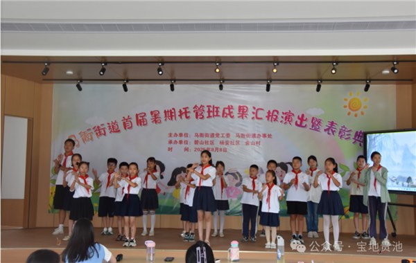 8月8日,馬衙街道金山村新建成的金山農(nóng)事服務(wù)中心2號樓熱鬧十足,馬衙街道首屆暑期托管班成果匯報演出暨表彰典禮在這里舉辦?!皩O女第一次上臺,看她抬頭挺胸的樣兒,太可愛了!”擠在過道里的金山村王大爺喜笑顏開地舉著手機(jī)為孫女錄像。談起本次托管班中印象最深刻的課程,現(xiàn)場的孩子們紛紛打開了話匣子:“我最喜歡用黏土做文物的那節(jié)課!”金山村吳芠萱小朋友對秀山門博物館講師帶來的“解碼池州·行走的文化地圖”巡講歷歷在目;“我現(xiàn)在是家門口老祠堂的小小講解員啦!”姜梓軒大聲匯報,他通過碧山社區(qū)志愿者吳星能設(shè)計的“古建筑拼圖”課學(xué)會了本地老宅的榫卯技藝……
