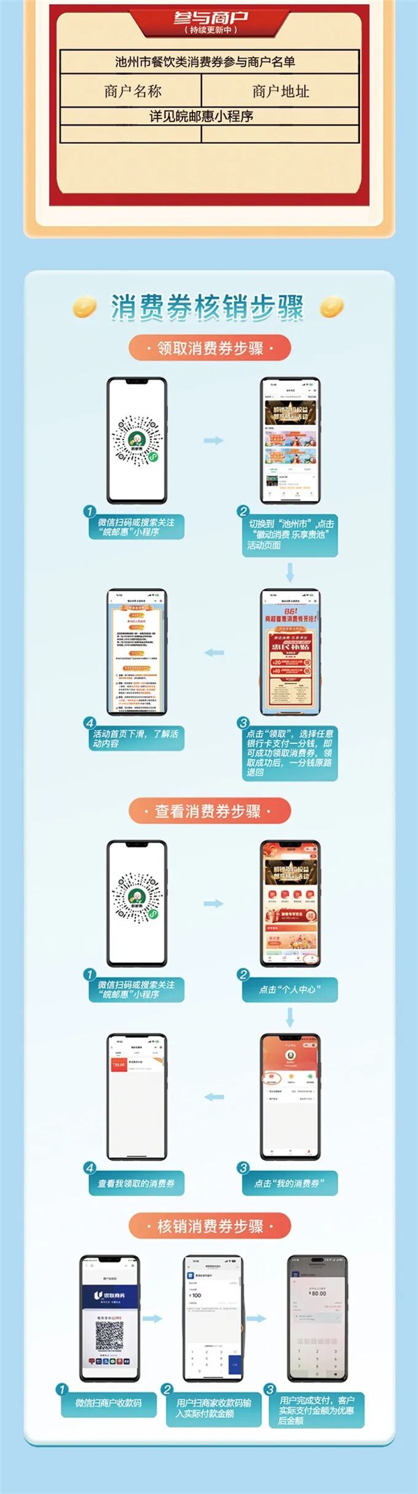 1.領(lǐng)取規(guī)則:活動期間,貴池區(qū)域內(nèi)消費者通過微信搜索中國郵政“皖郵惠”小程序,注冊登錄后選擇池州市專區(qū),點擊進(jìn)入“徽動消費·樂享貴池”領(lǐng)取頁面領(lǐng)券?;顒悠陂g,消費者可領(lǐng)取不同面額消費券各1張。消費券領(lǐng)取成功后可在“皖郵惠”小程序優(yōu)惠券中查看。