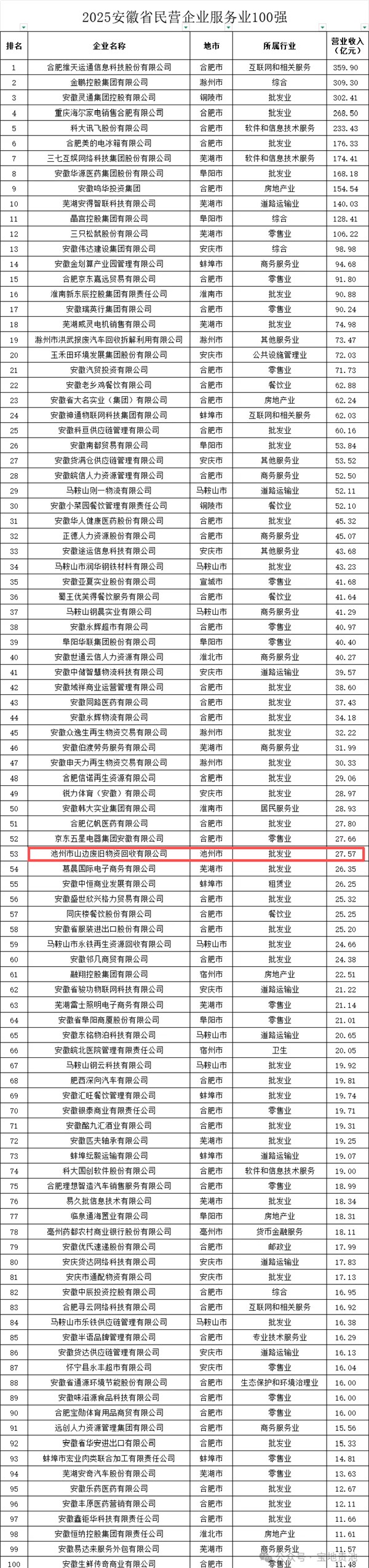 此外,10月16日上午,2025安徽省民營企業(yè)百強發(fā)布會在合肥舉行。會上發(fā)布了2025安徽省民營企業(yè)“營收百強”“制造業(yè)百強”“服務(wù)業(yè)百強”“吸納就業(yè)百強”榜單。其中,我區(qū)企業(yè)安徽省貴航特鋼有限公司、安徽友進冠華新材料科技股份有限公司、池州起帆電纜有限公司分別位列安徽民營企業(yè)營收百強榜第36、56、72名和安徽省民營企業(yè)制造業(yè)百強榜第25、41、51名;安徽省貴航特鋼有限公司、池州起帆電纜有限公司還分別位列安徽省民營企業(yè)吸納就業(yè)百強榜單第51位、62位;此外,池州市山邊廢舊物資回收有限公司位列安徽省民營企業(yè)服務(wù)業(yè)百強榜單第53位。