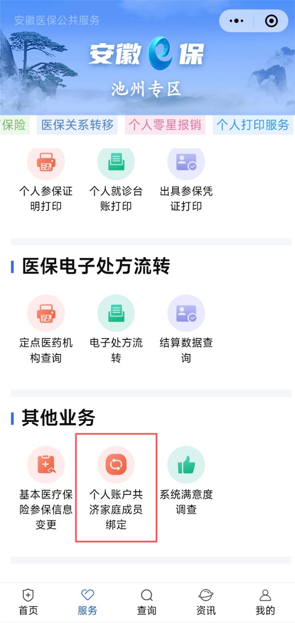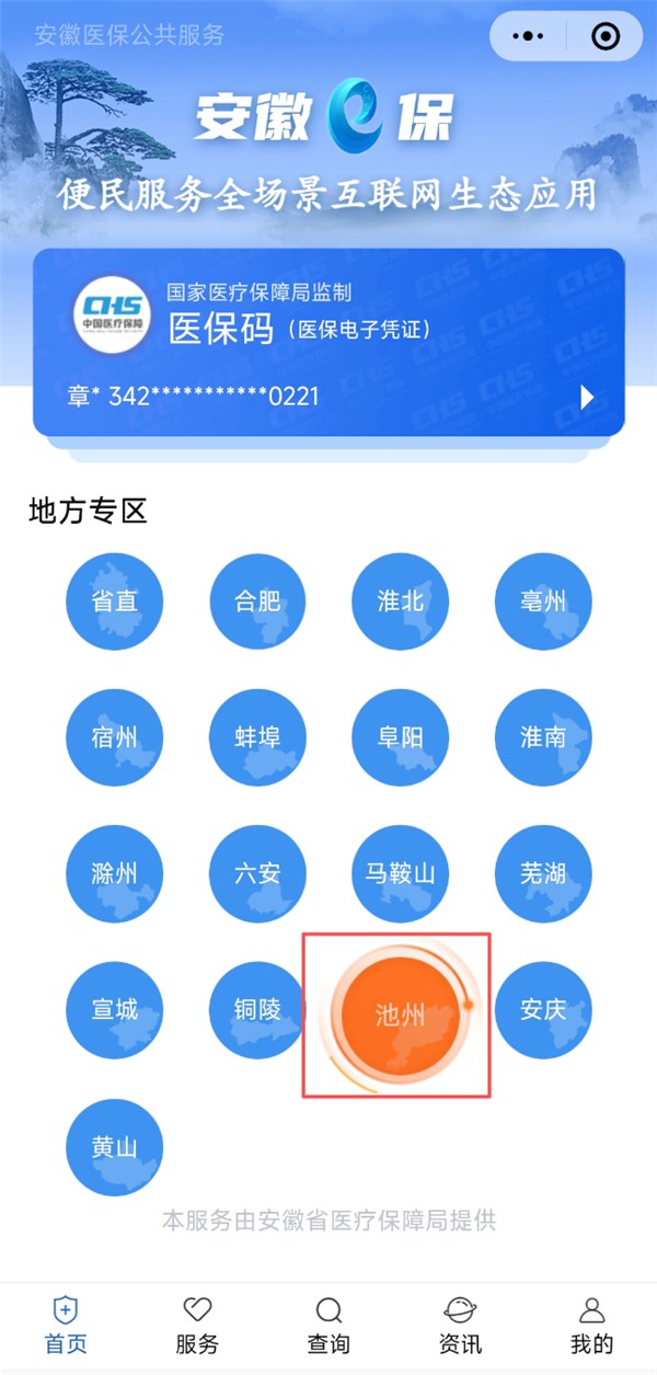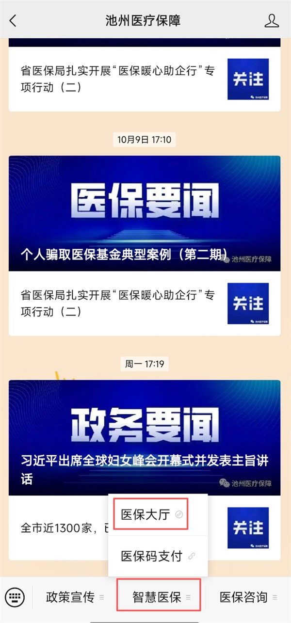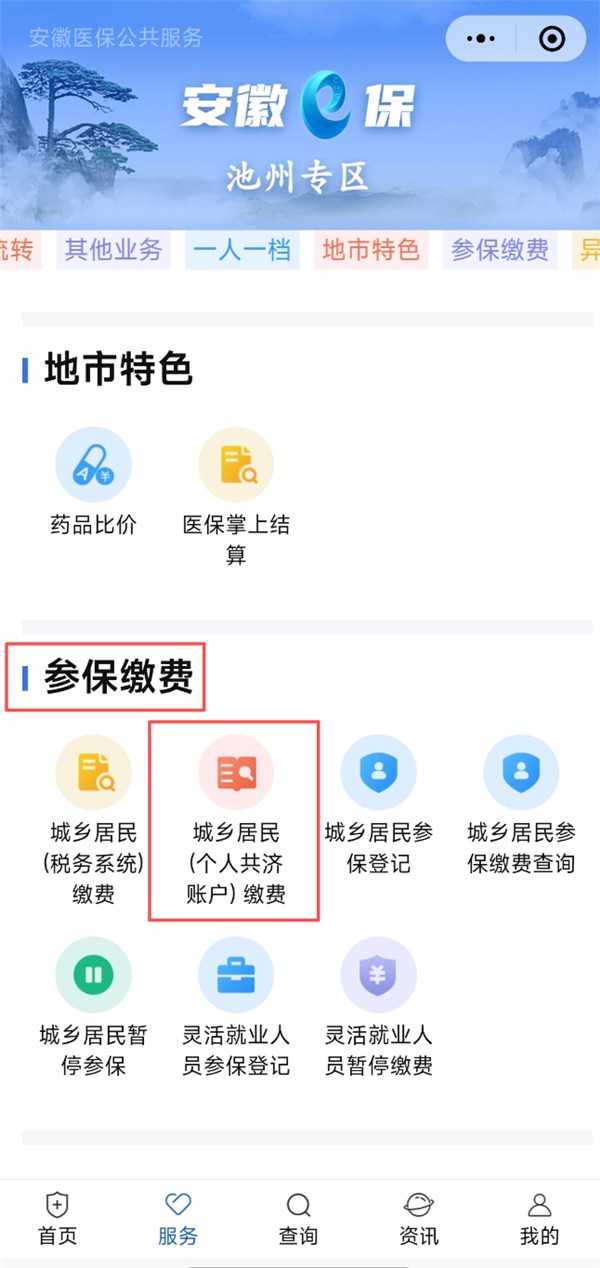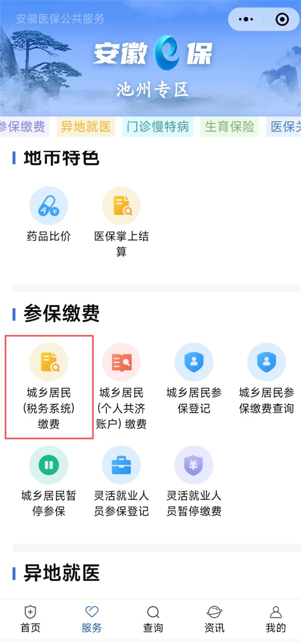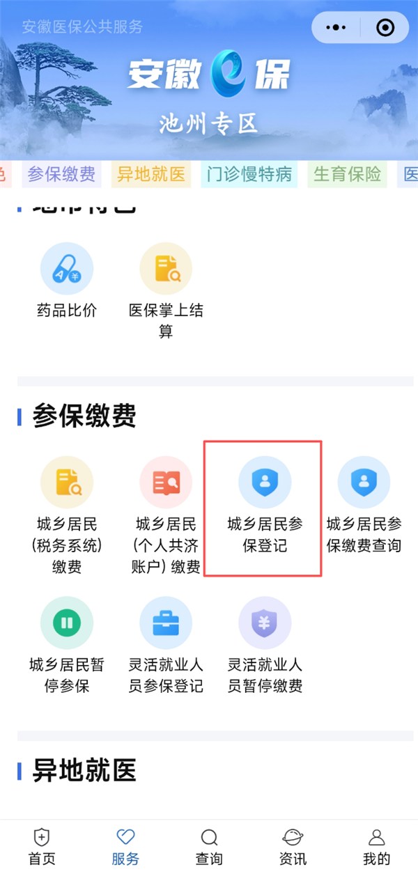 (二)線上辦理:關(guān)注并打開【池州醫(yī)療保障】微信公眾號,選擇【智慧醫(yī)?!俊踞t(yī)保大廳】,地方專區(qū)選擇【池州】,菜單欄點擊【參保繳費】模塊的【城鄉(xiāng)居民參保登記】。