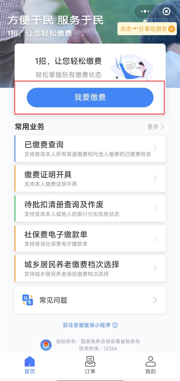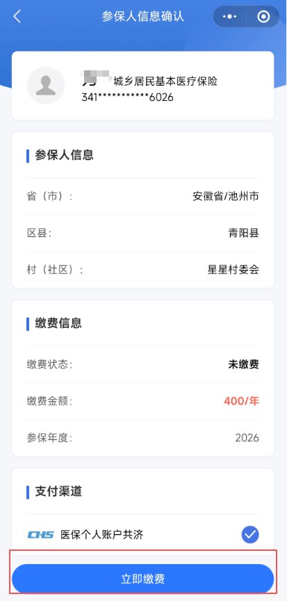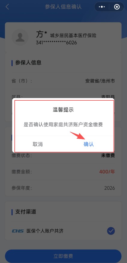 同時,在完成個人賬戶共濟綁定的前提下,還可選擇【城鄉(xiāng)居民(個人共濟賬戶)繳費】進行繳費。
