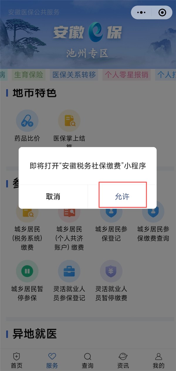 (一)微信繳費流程:關(guān)注并打開【池州醫(yī)療保障】微信公眾號,選擇【智慧醫(yī)?!俊踞t(yī)保大廳】,地方專區(qū)選擇【池州】,在【參保繳費】模塊選擇【城鄉(xiāng)居民(稅務(wù)系統(tǒng))繳費】,彈窗選擇【允許】進入【安徽稅務(wù)社保繳費】小程序;也可以直接在微信首頁搜索【安徽稅務(wù)社保繳費】小程序。