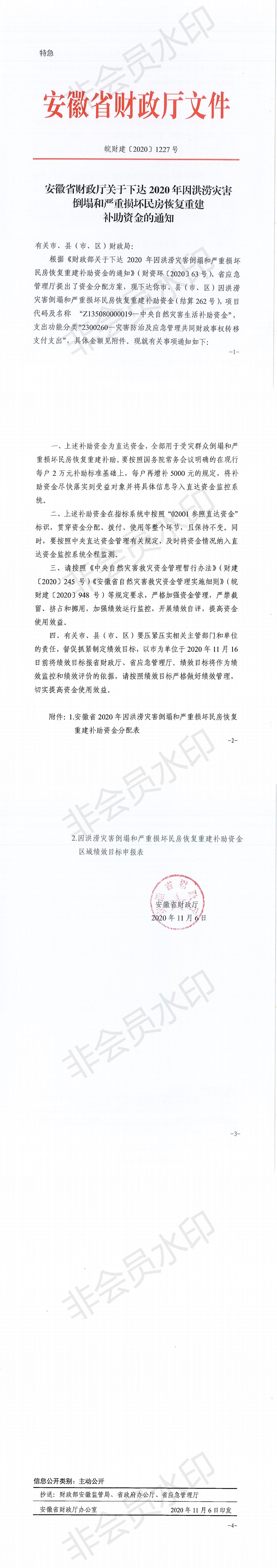 安徽省財政廳關于下達2020年因洪澇災害倒塌和嚴重損壞民房恢復重建補助資金的通知