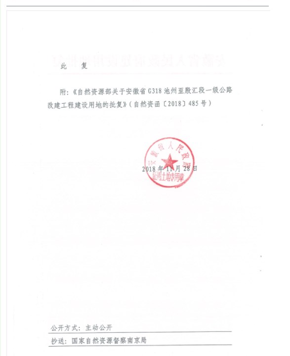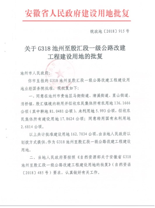 關于G318池州至殷匯段一級公路改建工程建設用地的批復(里山街道)