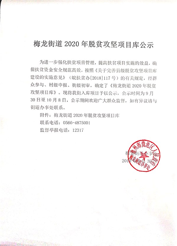 【項目庫公示】梅龍街道2020年脫貧攻堅項目庫公示