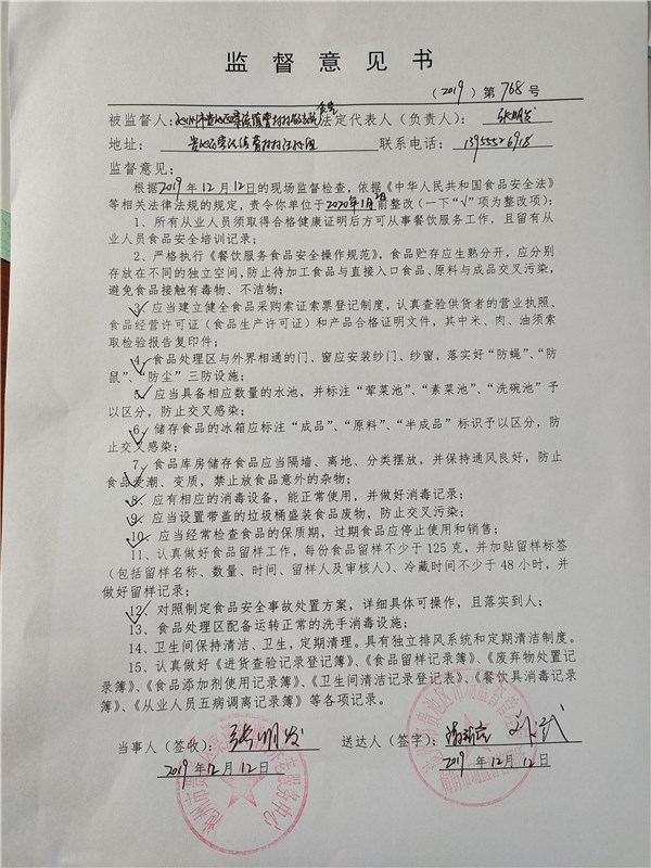 棠溪鎮(zhèn)曹村養(yǎng)老服務(wù)中心食品安全監(jiān)督意見書