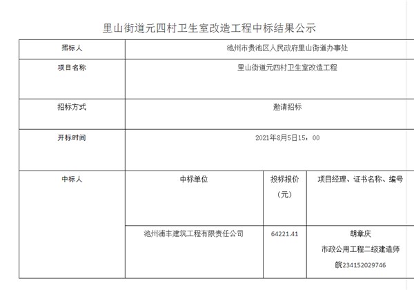 里山街道元四村衛(wèi)生室改造工程中標結果公示