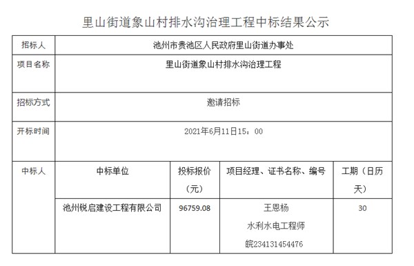 里山街道象山村排水溝治理工程中標(biāo)結(jié)果公示