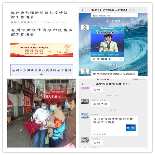 線上通過居民微信群、微信公眾號、社區(qū)小喇叭等推送清明祭掃倡議書小視頻和《池州市加強清明祭掃疫情防控工作通告》。倡導用綠色、新穎的祭祀方式助力戰(zhàn)“疫”,積極倡導文